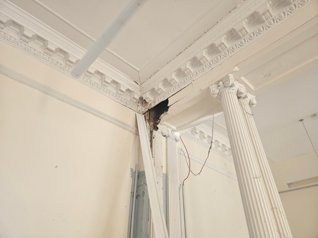 Our work includes repairs to ceilings, plaster, timber and decorative features affected by long-term leaks, water ingress, condensation and damp, using methods appropriate to the age and construction of the building.